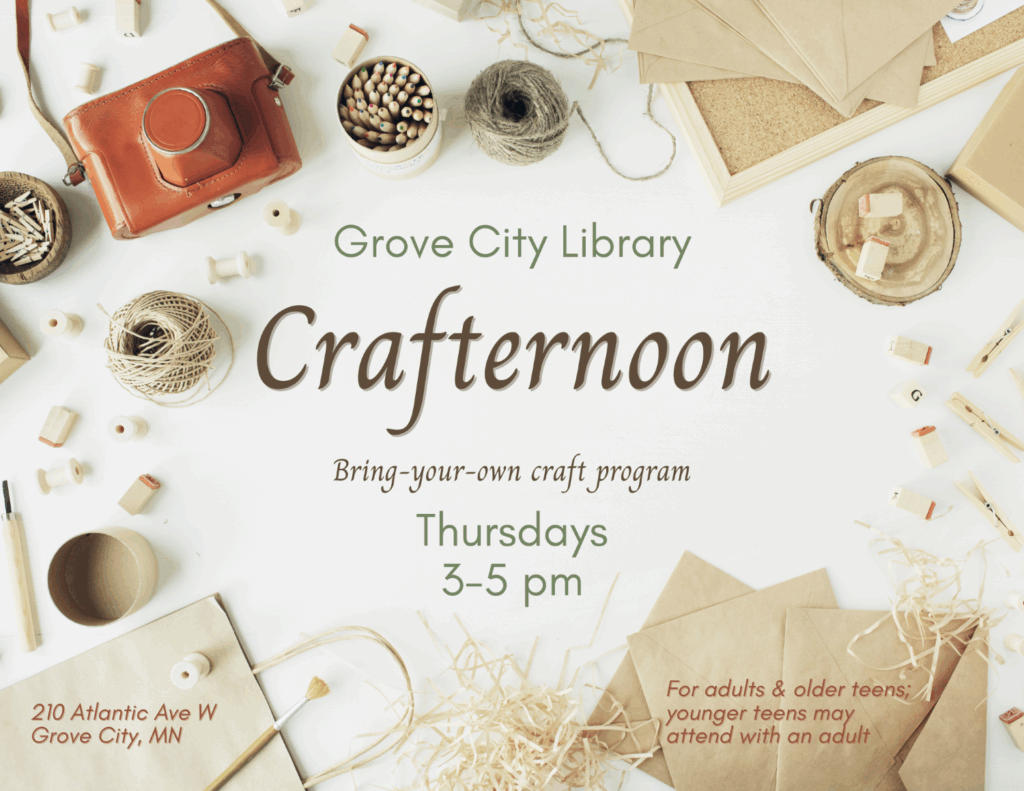 Grove City Library has a Crafternoon bring-your-own craft program every Thursday from 3-5 pm! Adults and teens age 16 and up are welcome to bring their craft project in progress to the library to work alongside other creative people. Younger teens are welcome if accompanied by an adult.