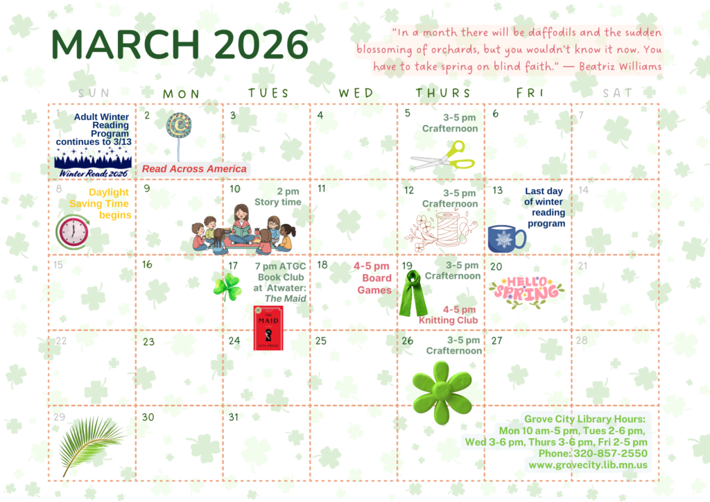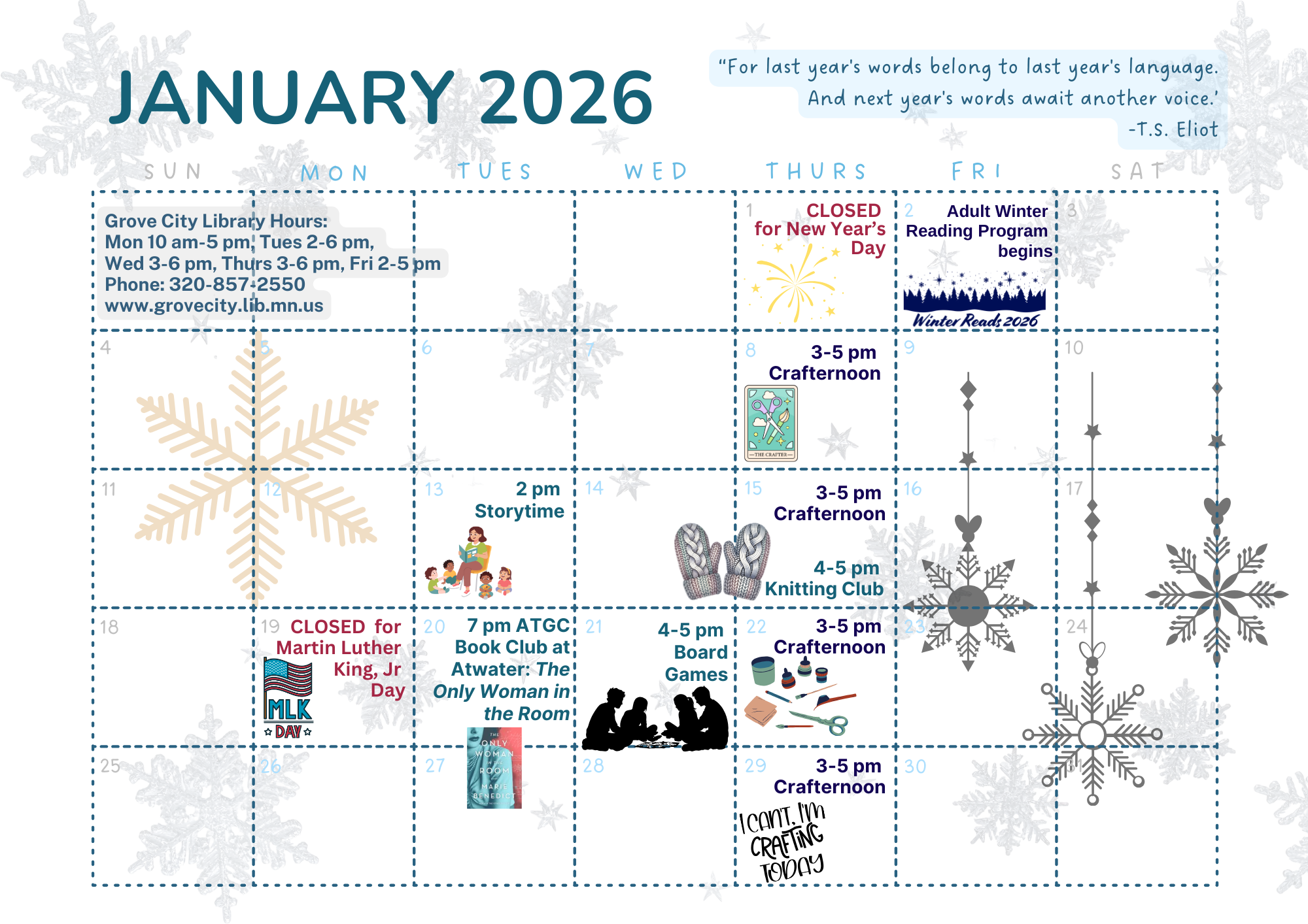 January means the start of Winter Reads, the adult winter reading program for Pioneerland Library System. The program starts at the Grove City Library on Friday, January 2, and ends Friday, March 13.