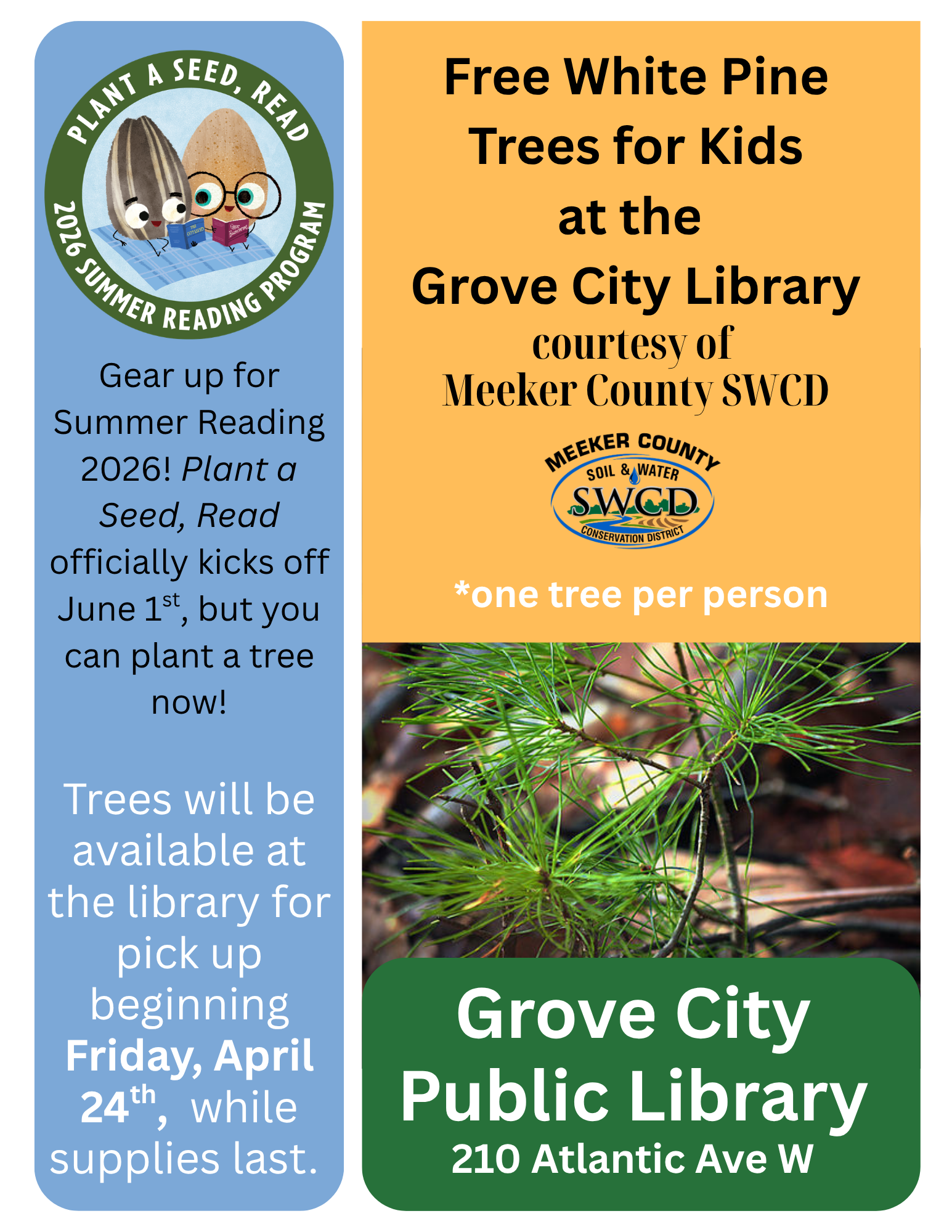 We have a preview of the summer reading program, Plant a Seed, Read – with trees! On Arbor Day, Friday, April 24, the Grove City Library will offer free trees for kids. White pine saplings will be available to pick up by 3:00 that day and while supplies last, courtesy of the Meeker County Soil & Water District.